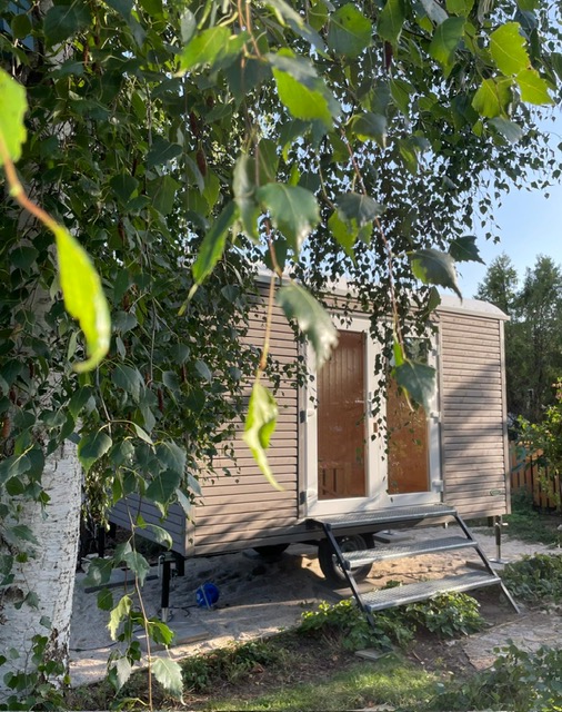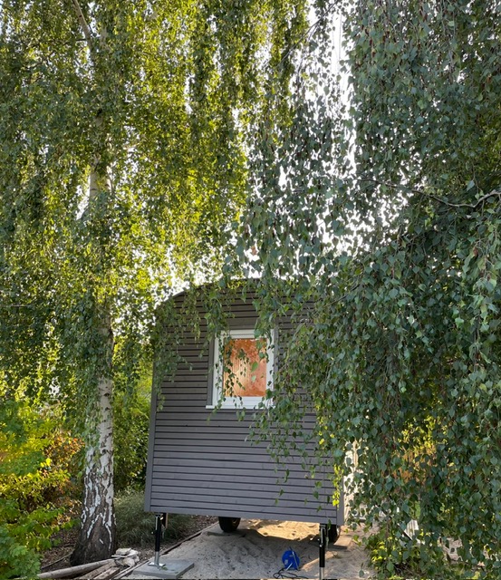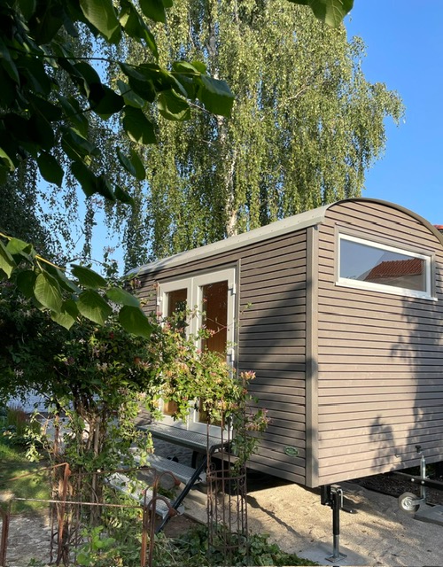 Der Bauwagen „Gartenglück“ ist 4m lang, hat eine Außenverkleidung „Trendline“ aus Fichte hellgrau lasiert mit schwarzer Kontrastnut.
