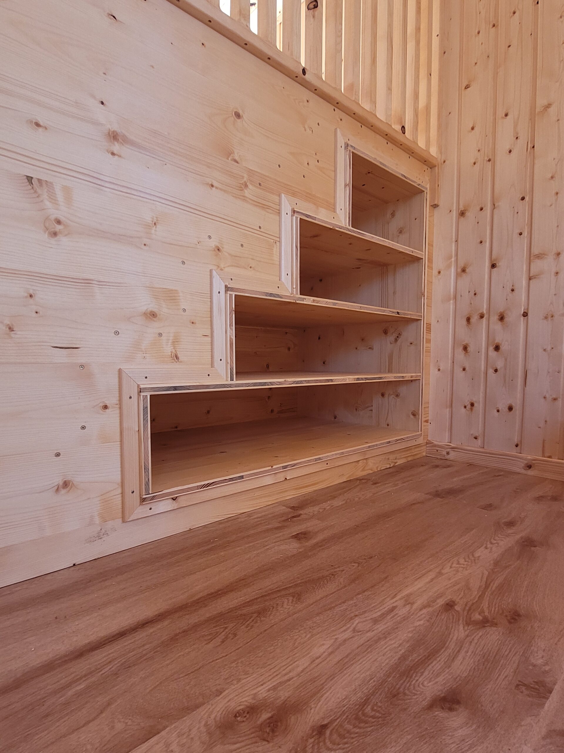 - inkl. Komplettausbau wie Garderobenleiste, Tische, Sitzbank mit Stauraum, Sitzbank klappbar, Hochebene inkl. Treppe mit Stauraum, offene Regale inkl. Schuhbank