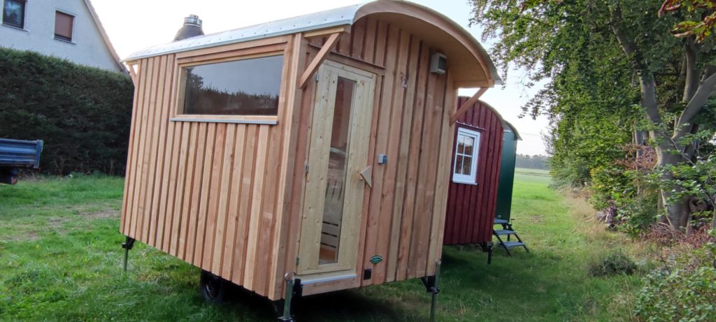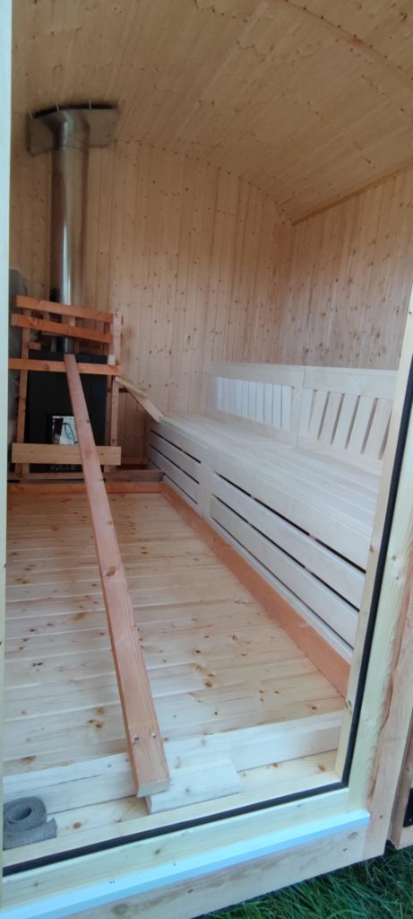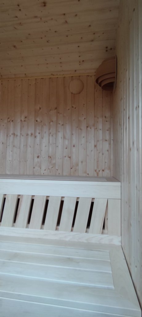 Dieser Saunawagen ist vollständig isoliert. Die erzeugte Wärme ist ausreichend, auch für ausgiebige Saunagänge. Die Bank bietet zwei Höhen, so ist für jeden Saunatyp die passende Temperatur wählbar.