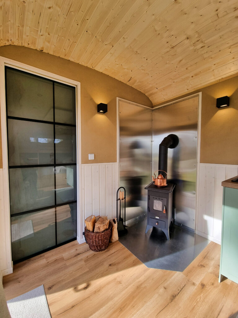 Der 2025 neu gebaute Wagen verfügt über einen Wohn- /Schlafbereich, ein separates Bad sowie eine voll ausgestatteter Küche. Der kleine Kamin lädt bei jedem Wetter zu gemütlichen Stunden ein, während ihr durch das Panoramafenster den Blick in die Ferne schweifen lasst.