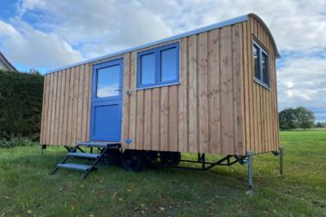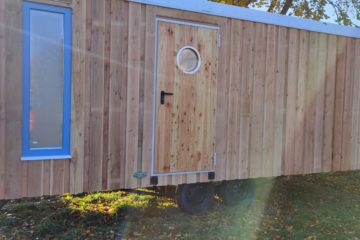 Ein Bauwagen in himmlischen Blau der als Tinyhouse ausgebaut wurde. Das integrierte Doppelbett bietet für Weiterlesen…